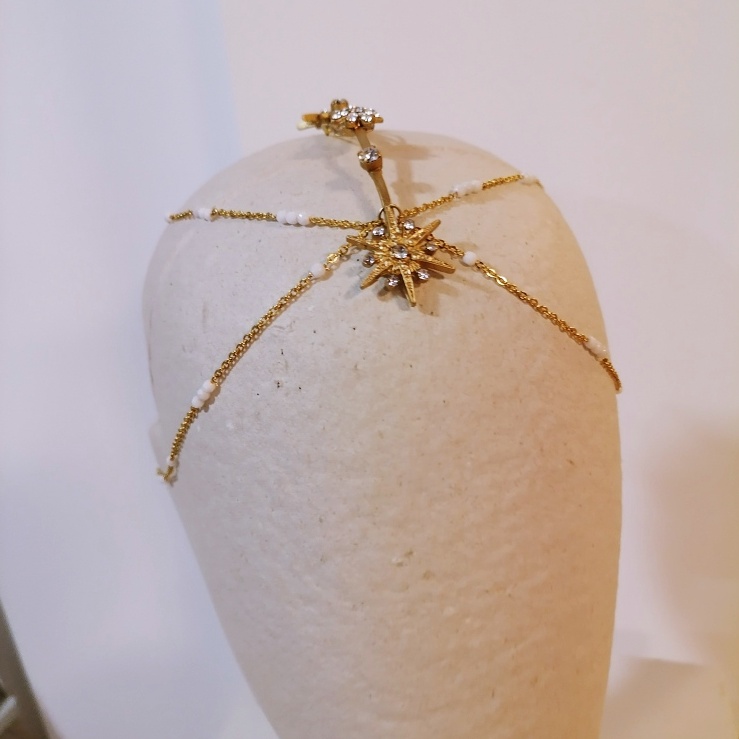 Cubreraiz con estrelliatas de metal dorado y cadenas laterales. Todos los cristales se pueden cambiar de color. Se puede hacer en plata. Todos los tocados los hago personalizados con lo que se puede hacer cualquier modificación (el precio puede variar). El precio incluye IVA. La web es solamente informativa, no se puede comprar. Para compras por whatsapp 651758623 o email julietaelx@gmail.com