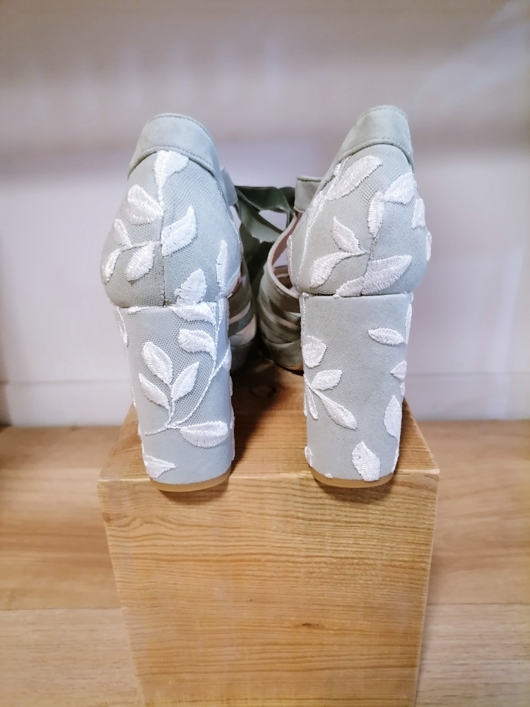 Sandalias cerradas por detras en ante verde salvia con enrrejado de tul y lazada de terciopelo al tono. El tacon va forrado con el mismo tul de su vestido de novia.