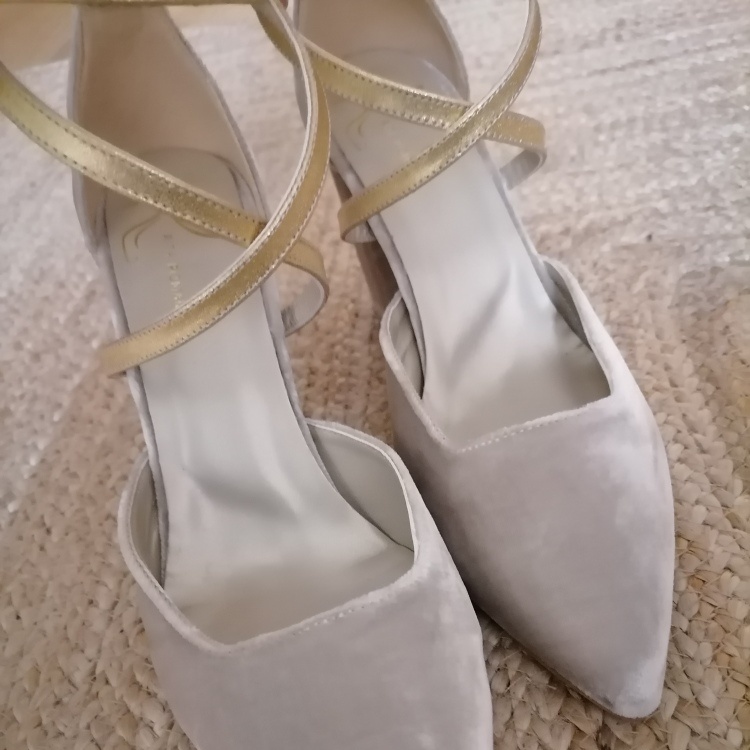 Zapatos personalizados en terciopelo con tiras doradas. Tacon 8cm....