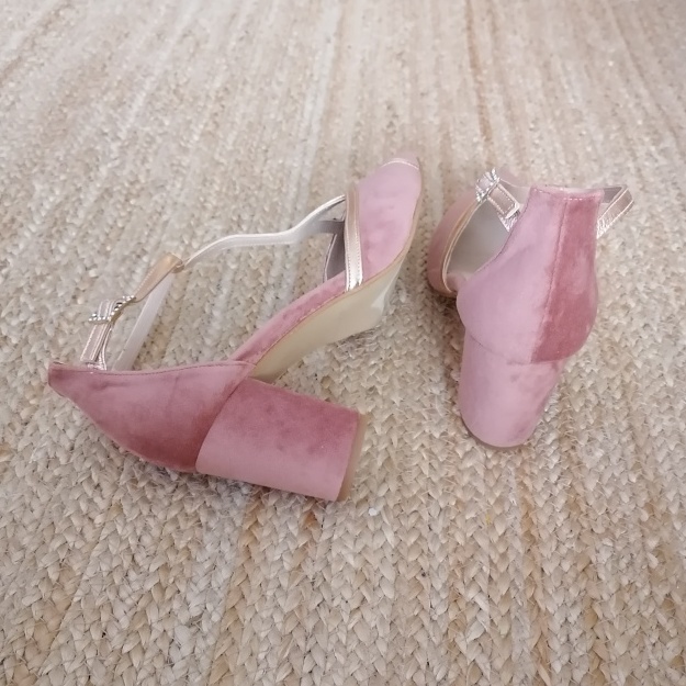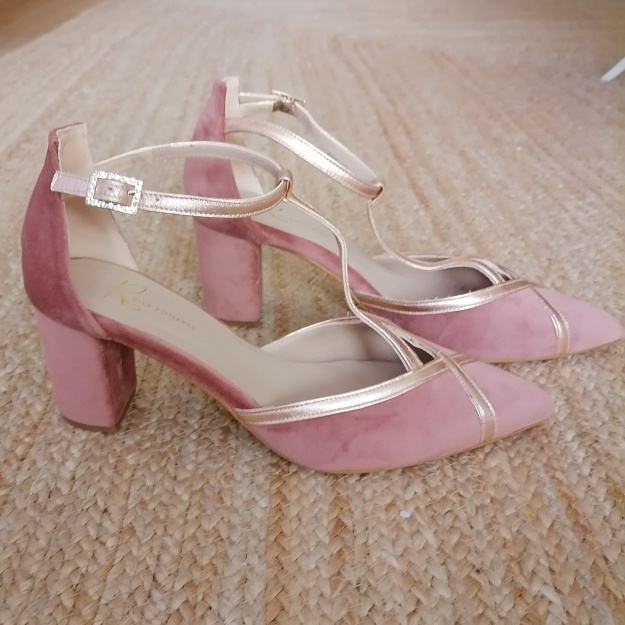 Zapato en terciopelo rosa viejo ribeteado en oro rosa