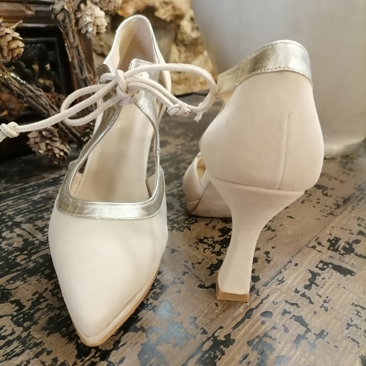 Zapato cerrado con lazada, confeccionado en ante beig y ribetes en dorado champan...