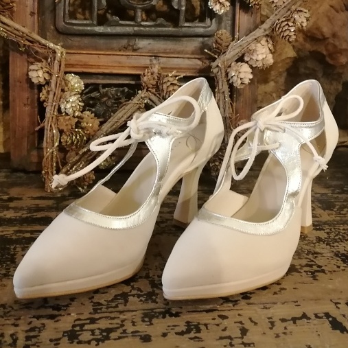 Zapato cerrado con lazada, confeccionado en ante beig y ribetes en dorado champan