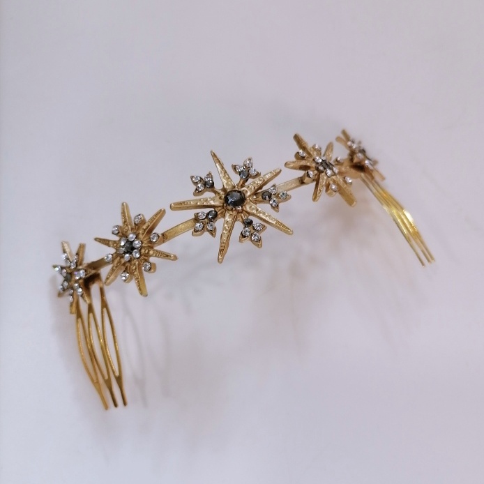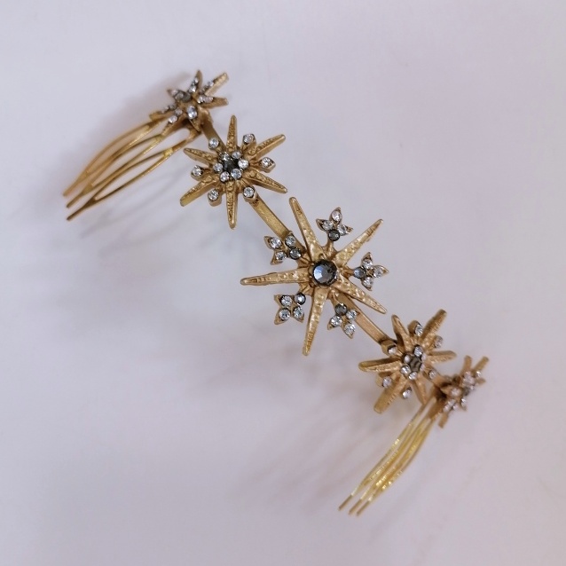 Tocado alta bisutería compuesto por cinco estrellas. El tocado ha sido hecho desde cero en nuestro taller de Elche. Los cristales de las estrellas se pueden cambiar de color / el tocado se puede hacer en plata. Mide unos12cm. largo Sujeción con peinetas en los extremos. El precio incluye IVA