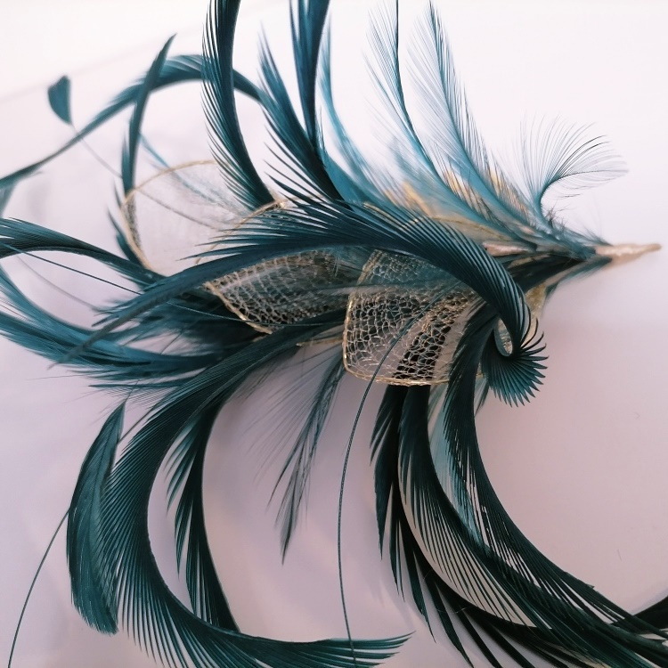 Aplique de plumas variadas y hojitas de rejilla. Las plumas se tiñen en nuestro taller por lo que se puede hacer en cualquier color, las hojitas de rejilla se pueden hacer en otros colores. Sujecion con peineta central y presillas para horquillas en los extremos. Ideal para poner sobre un recogido o para poner en un lateral. El precio incluye IVA