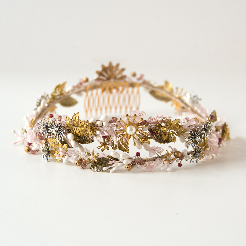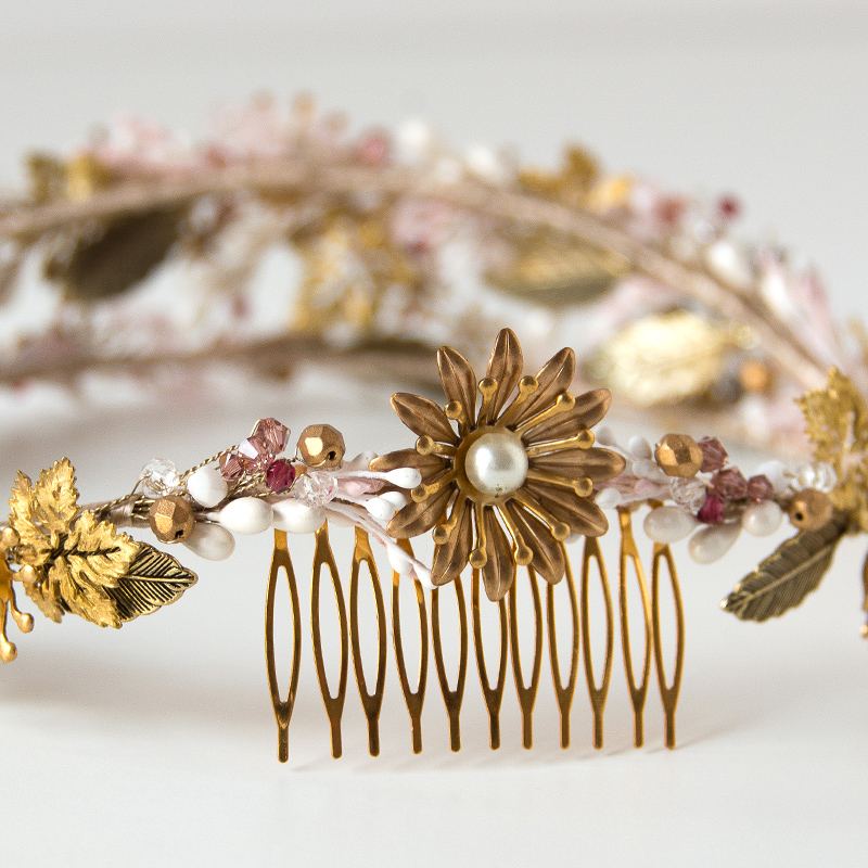 Corona adornada con florecitas y hojas de metal en dorado / plata vieja, cristales y ramitas de pistilos variados. Alambrada y forrada con hilo de seda en dorado. Sujecion con peineta trasera y presillas para horquillas en los laterales. Consultar disponibilidad de colores. Las coronas no tienen un tamaño estandar, se hacen del tamaño de cada cabeza. Los tocados los hago totalmente personalizados, se puede cambiar color, diseño y hacer tocados diferentes a los que veis en la web. El precio incluye IVA