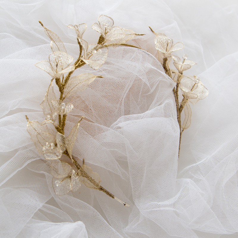 Flores y hojitas con base de alambre y rejilla en dorado y marfil. Tanto las flores como las hojas han sido hechas completamente a mano en nuestro taller de Elche. Consultar disponibilidad de colores. Los tocados los hago totalmente personalizados por lo que aparte del color se puede modificar diseño asi como tambien se puede hacer cualquier otro tipo de tocado, no tiene porque ser una diadema. El precio incluye IVA