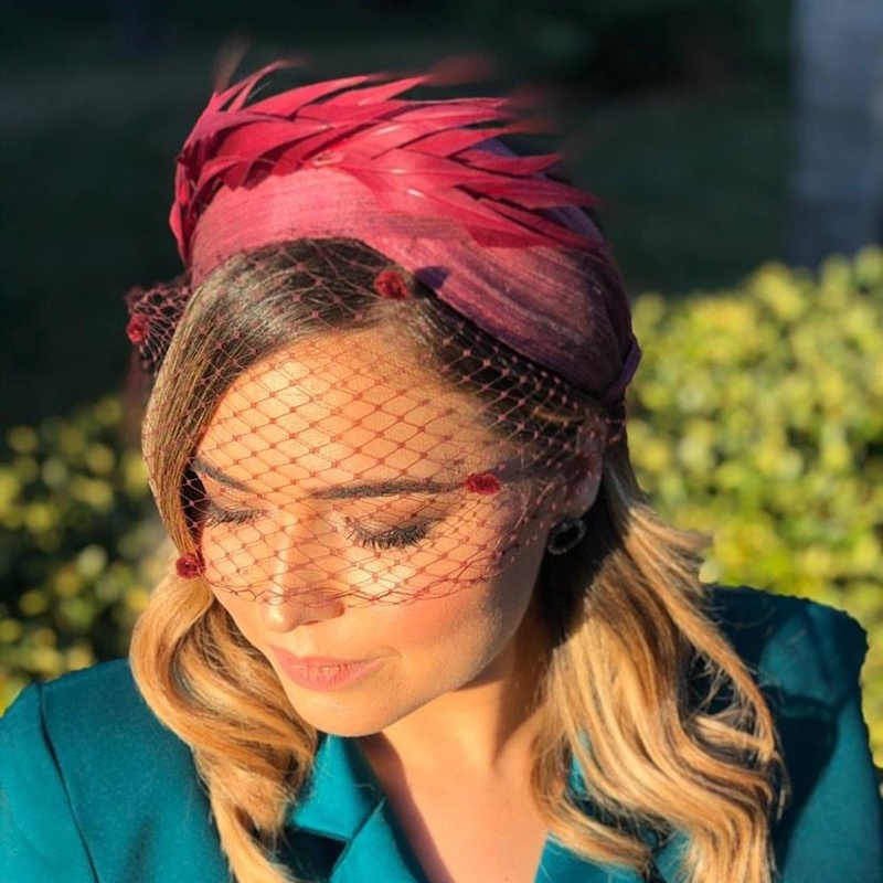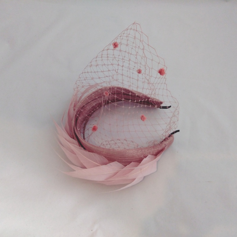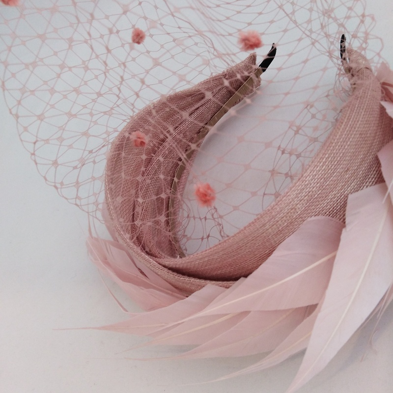 Diadema confeccionada en sinamay seda con adorno de plumas y velito a la cara. Diadema montada y cosida integramente a mano en nuestro taller al igual que el montaje de plumas, tenidas, recortadas y montadas a mano. Consultar disponibilidad en otros colores. Todos los tocados se hacen personalizados. El precio incluye IVA
