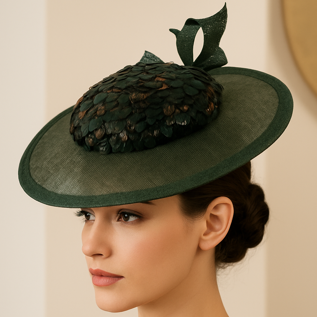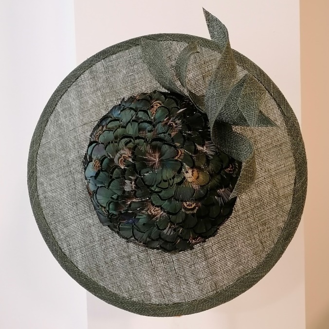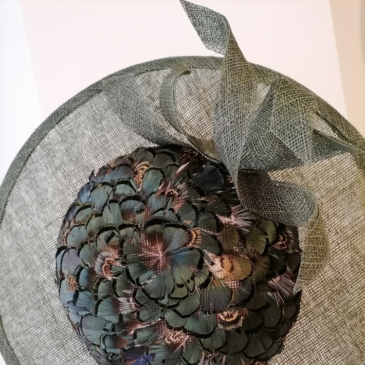 Tocado en sinamay con su parte central cubierta de plumas de faisan y adornado con espirales en el mismo tejido. El tocado esta teñido, ahormado y cosido completamente completamente a mano. Las plumas han sido puestas una a una. Al ser una pieza artesanal se puede hacer en cualquier color o combinación de colores. La parte central se puede hacer sin cobertura de plumas (el precio variaria). El precio incluye IVA